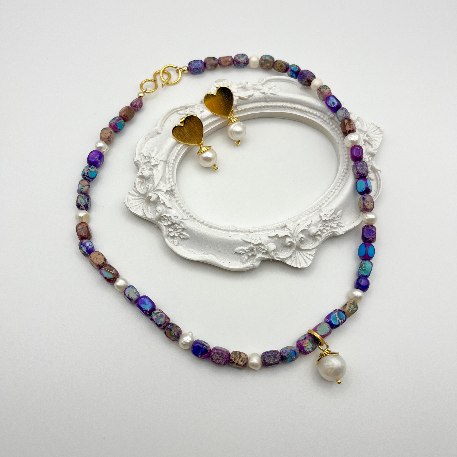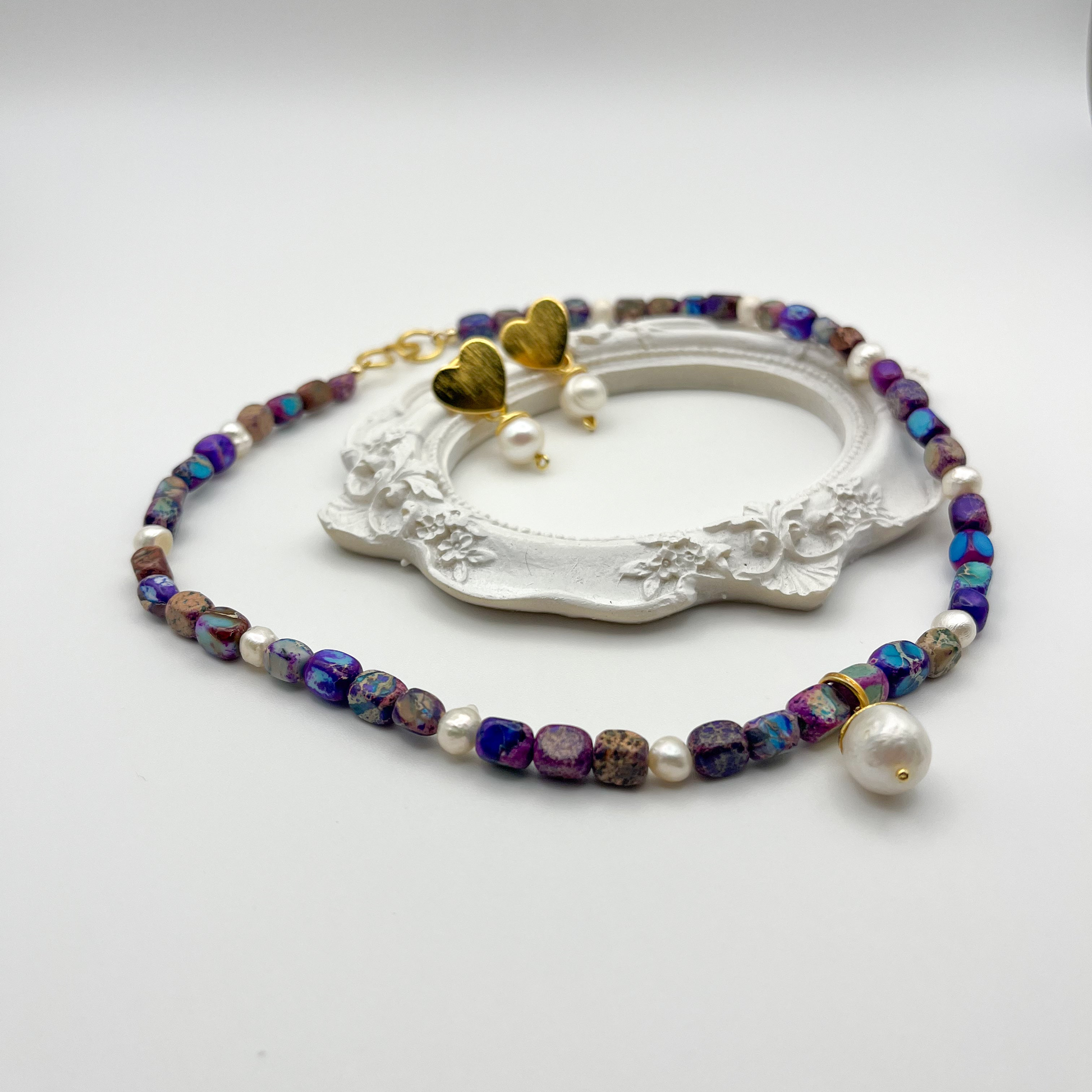 A beautiful set combining cultured pearls with iridescent purple natural stones.