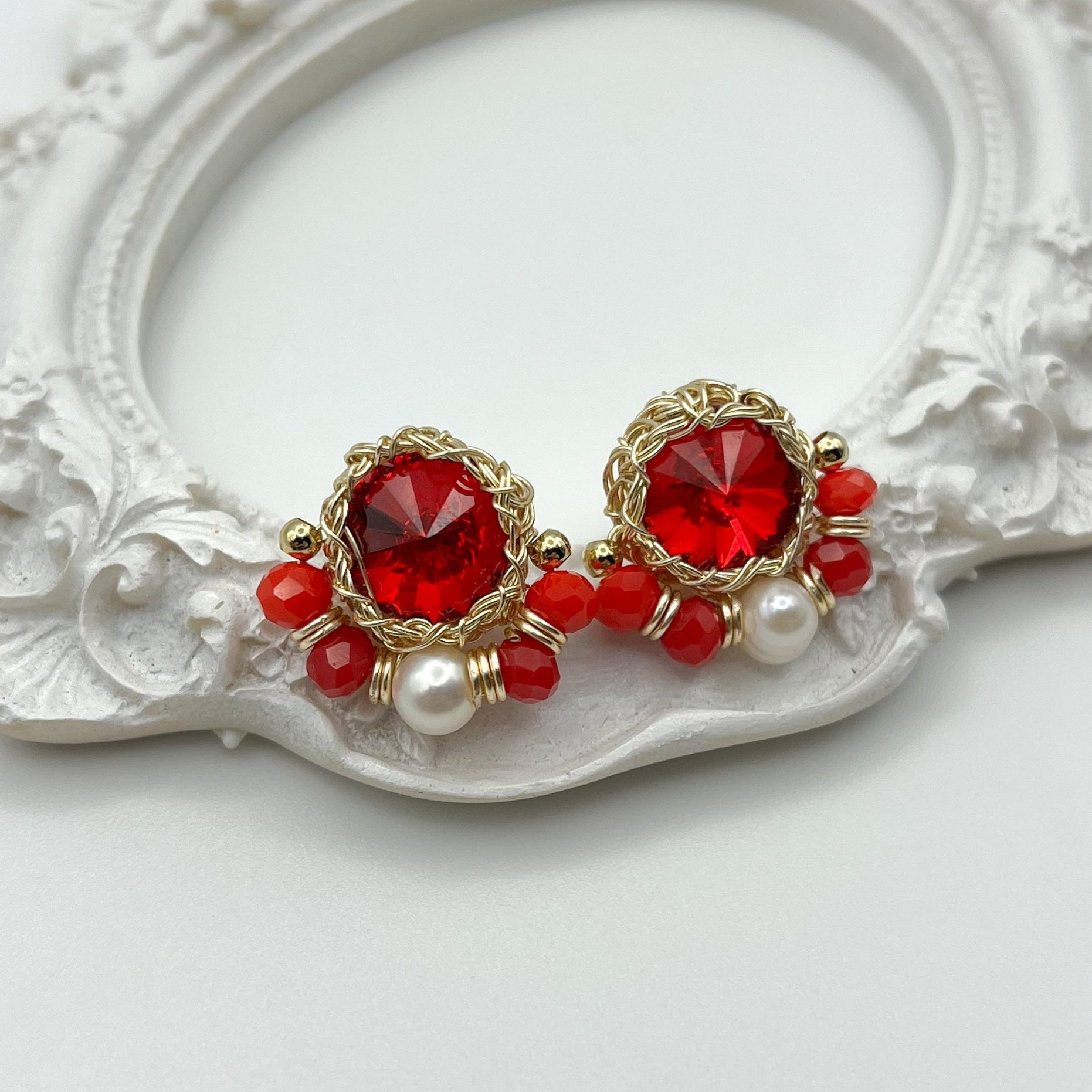 These earrings feature a unique design crafted from wire and a crystal adorned with delicate pearls and crystals. Perfect for adding a touch of elegance to any outfit. Handcrafted for a one-of-a-kind look.