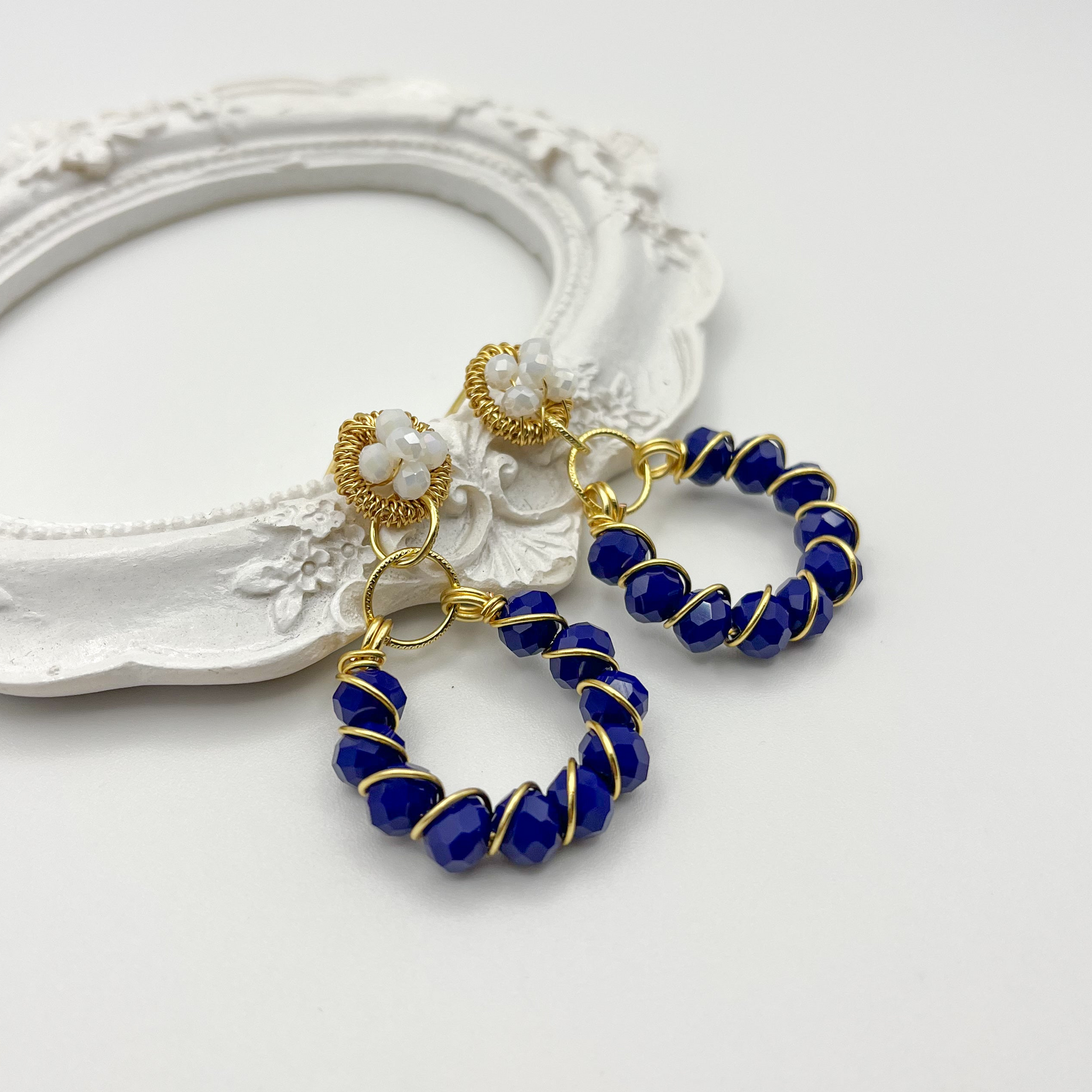 Earrings with a wire-wrapped hoop design. Decorative post with a cluster of crystals in gold filigree. Faceted stones with natural brilliance are individually wrapped around the hoop, creating a luminous and sophisticated effect. Available in multiple stone colors. A versatile piece that combines classic elegance with contemporary craftsmanship.