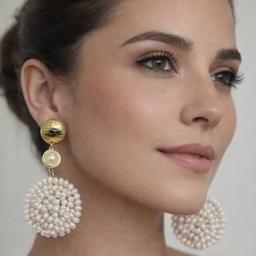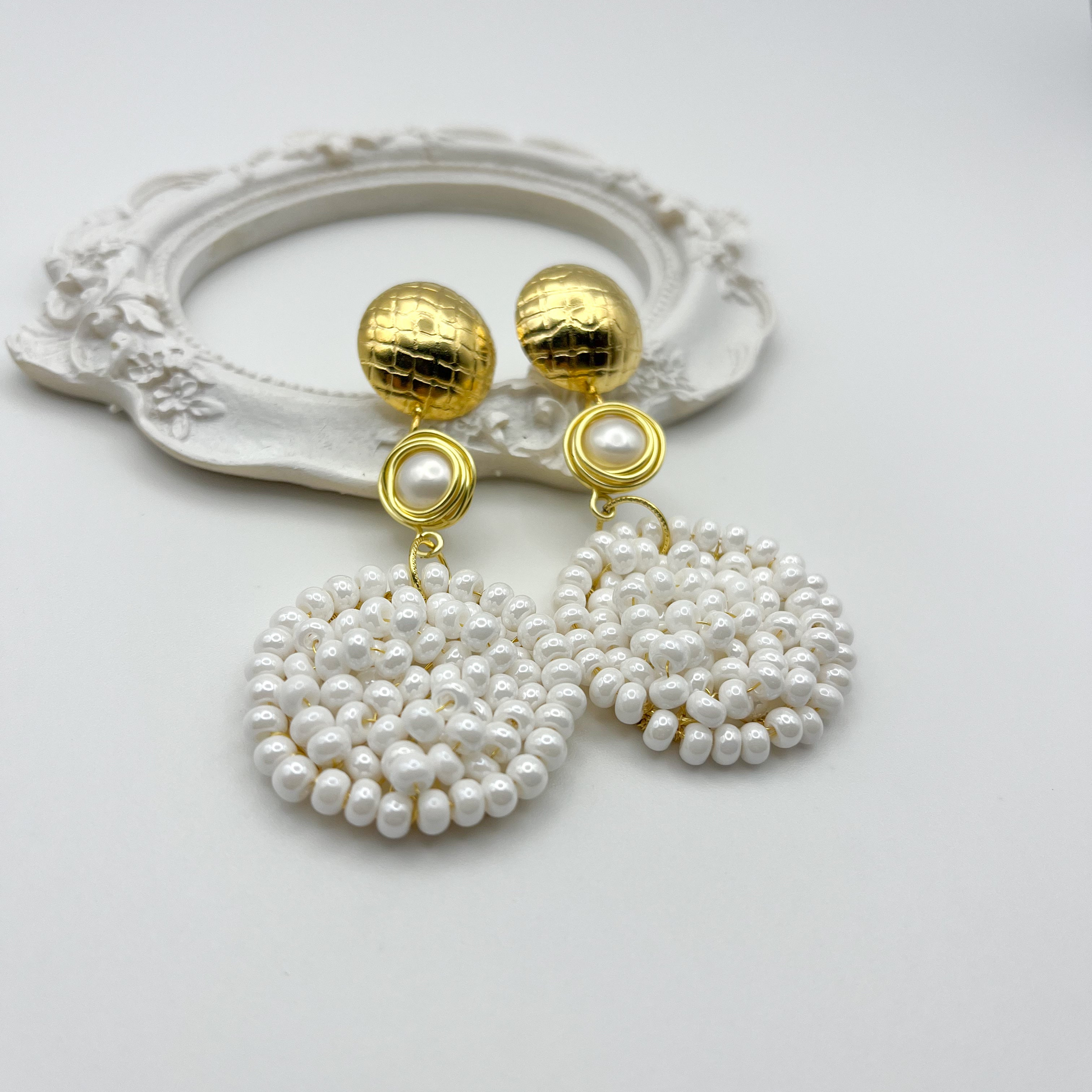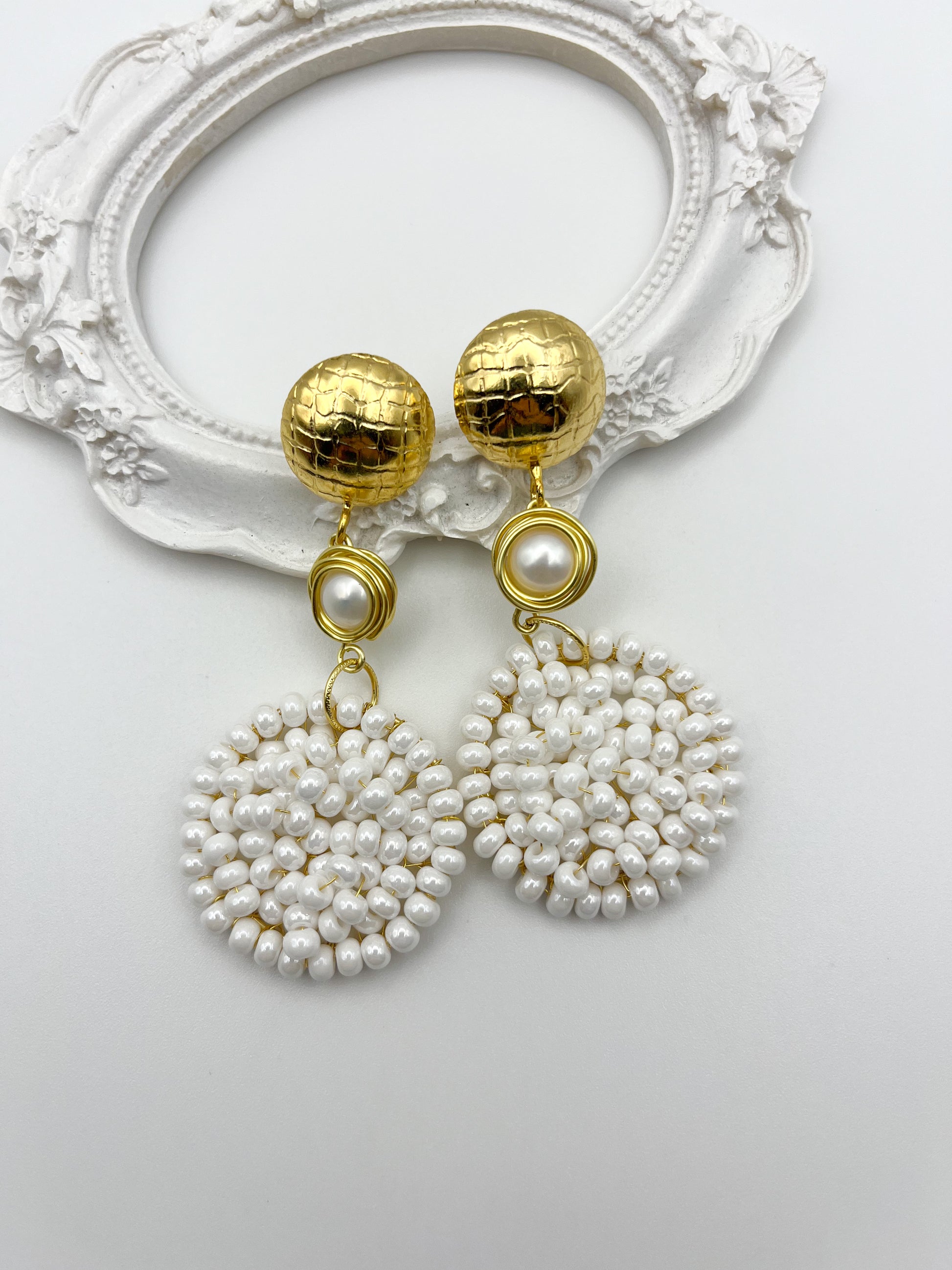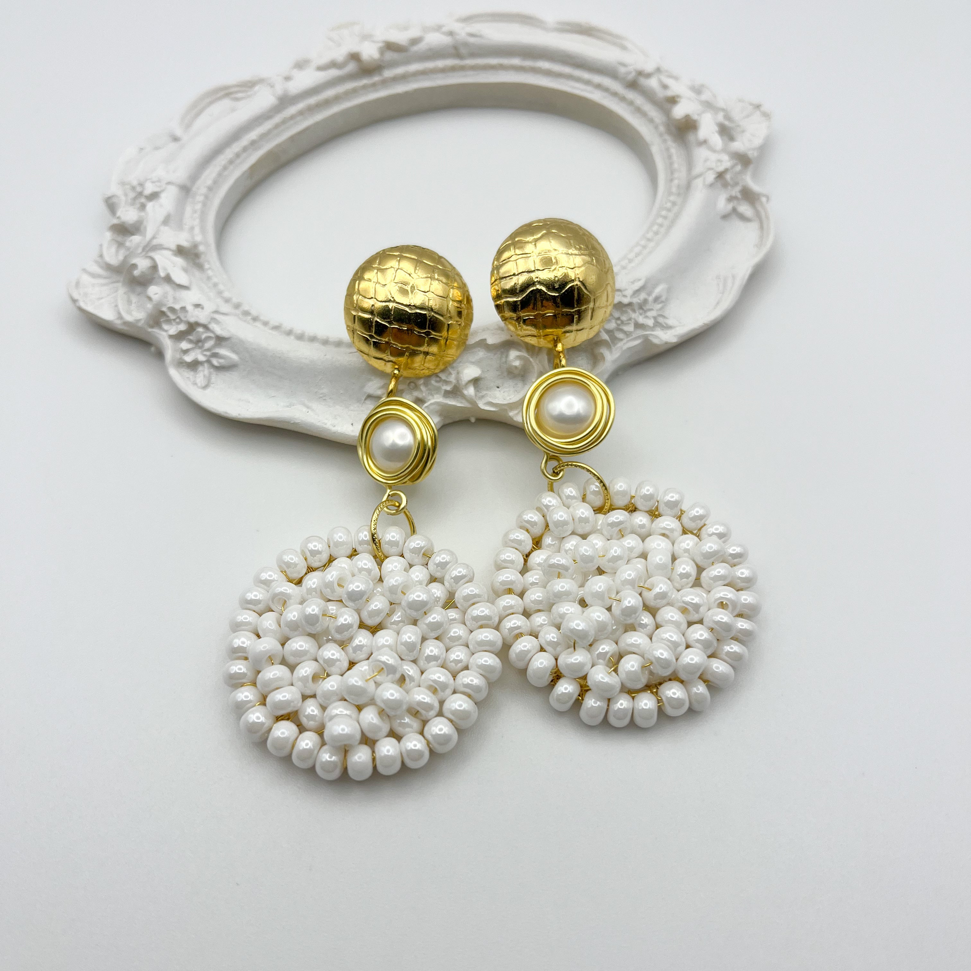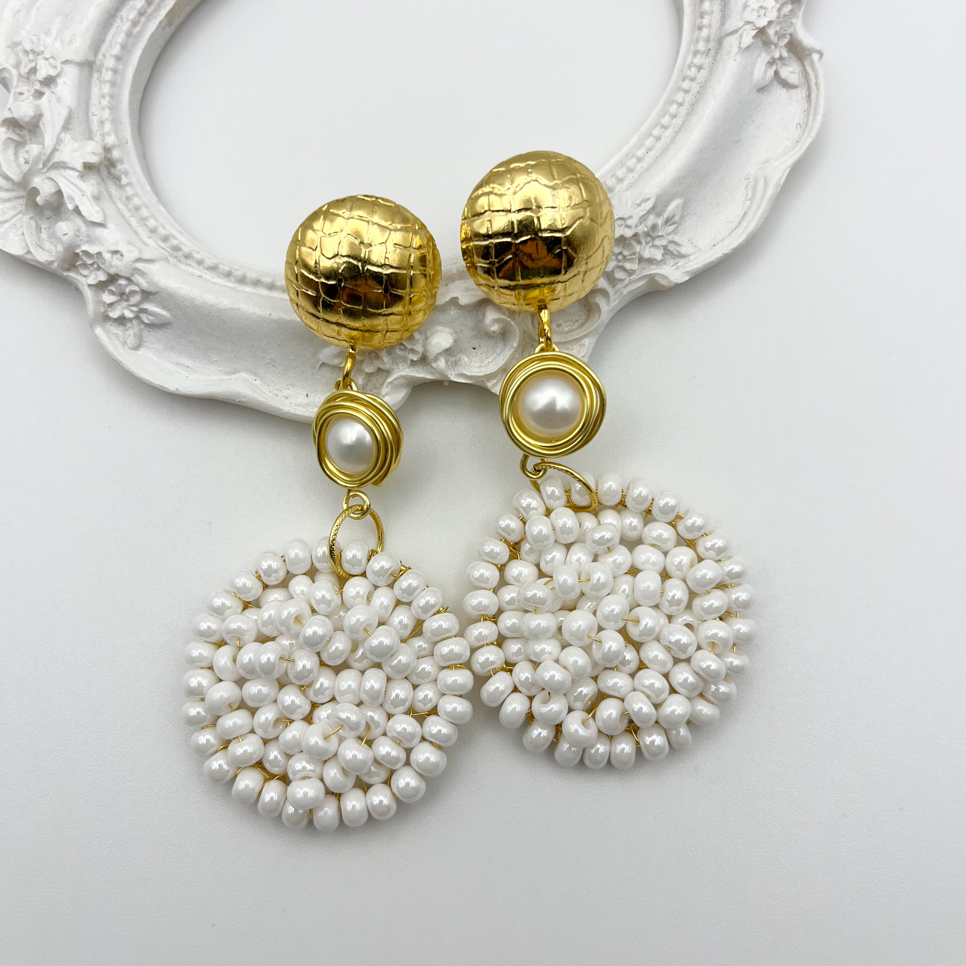 Each medallion is meticulously woven with small white stones that form a perfect circle, creating a rich and dimensional texture. The contrast between the gleaming gold and the pearly stones provides impeccable visual balance.