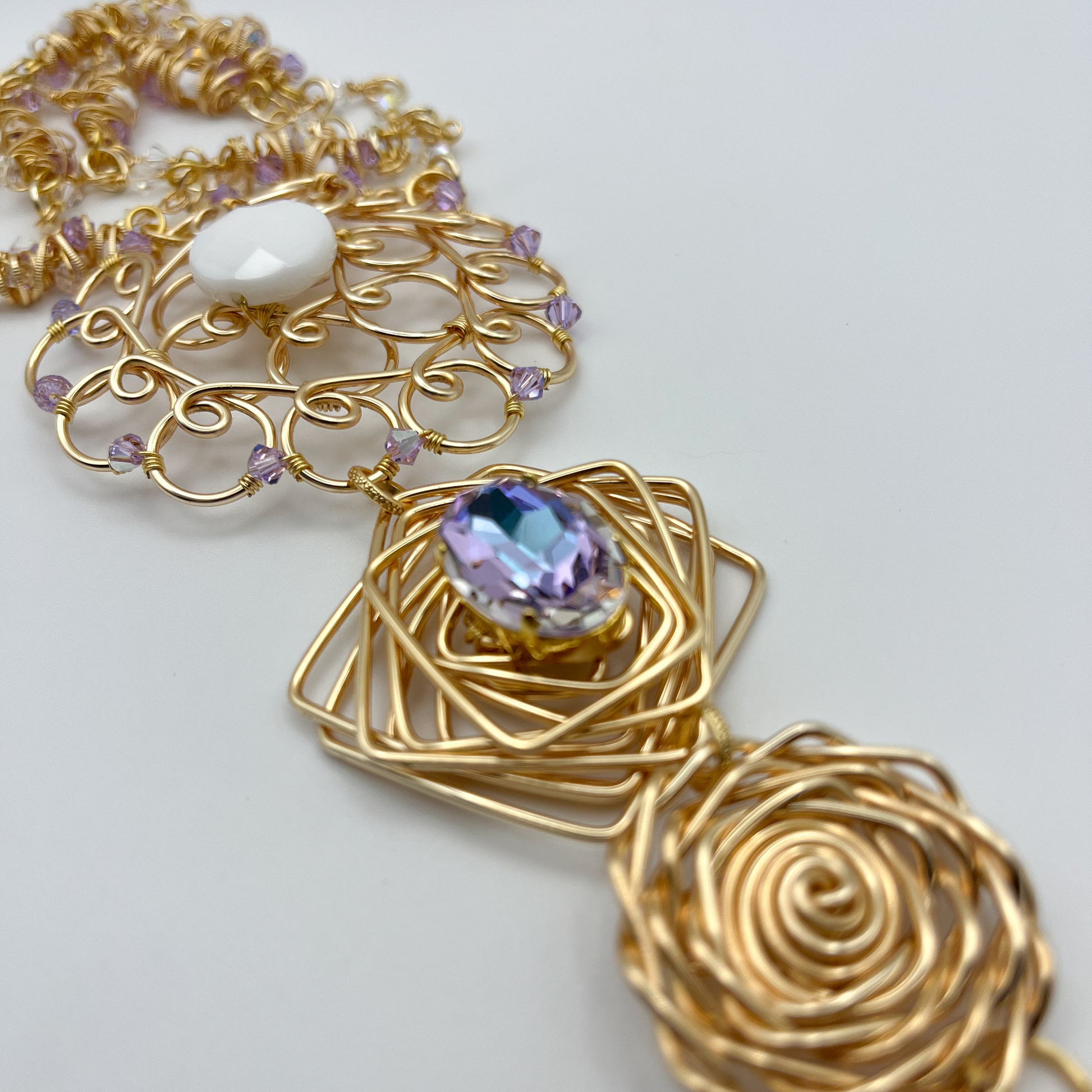 This stunning long necklace features a handcrafted design made with gold wire that forms intricate spiral patterns. The centerpiece is a beautiful wire mandala with delicate swirls that create an oversized floral medallion.