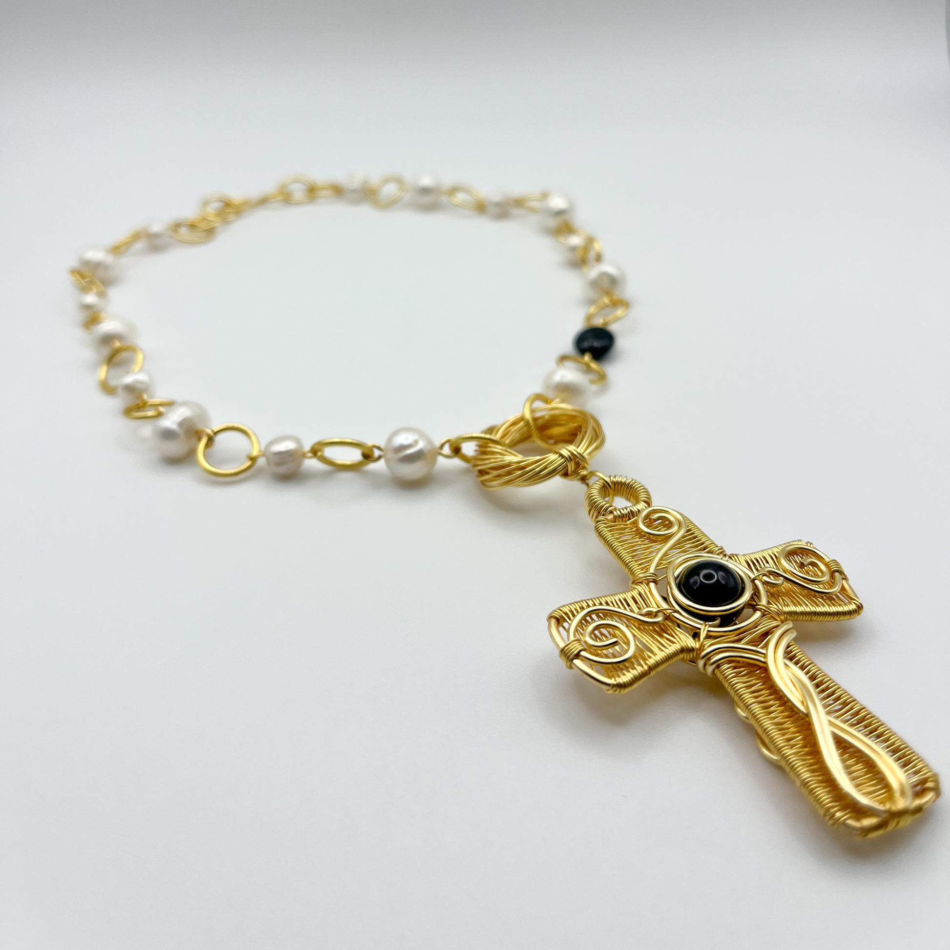 A statement necklace that fuses sacred symbolism with exceptional craftsmanship. This piece features a meticulously hand-woven gold filigree cross, adorned with a black cabochon stone at its center, suspended from a chain of cultured pearls and gold links.