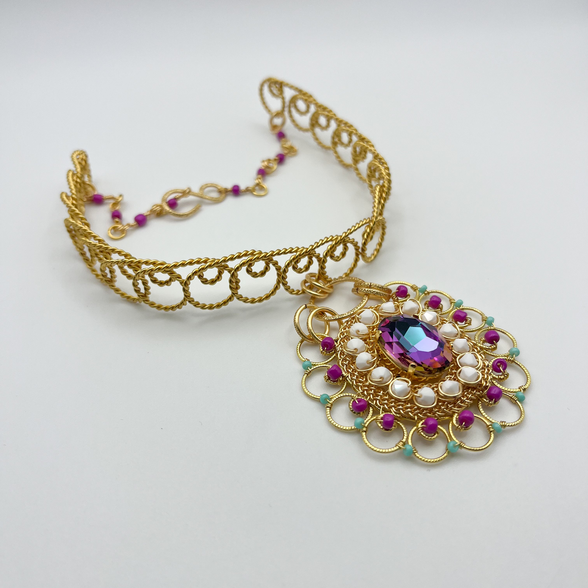 This choker is a handcrafted creation that stands out for its majestic and detailed design. Handmade with gold-plated copper wire and a protective polymer coating, it features a central pendant with a faceted stone, surrounded by a delicate lattice of white, fuchsia, and green beads. Its gold-plated structure, with a braided link design, adds a touch of vintage elegance and sophistication. Ideal for special occasions or for those seeking a unique piece of jewelry that highlights their style with an air of handcrafted luxury.