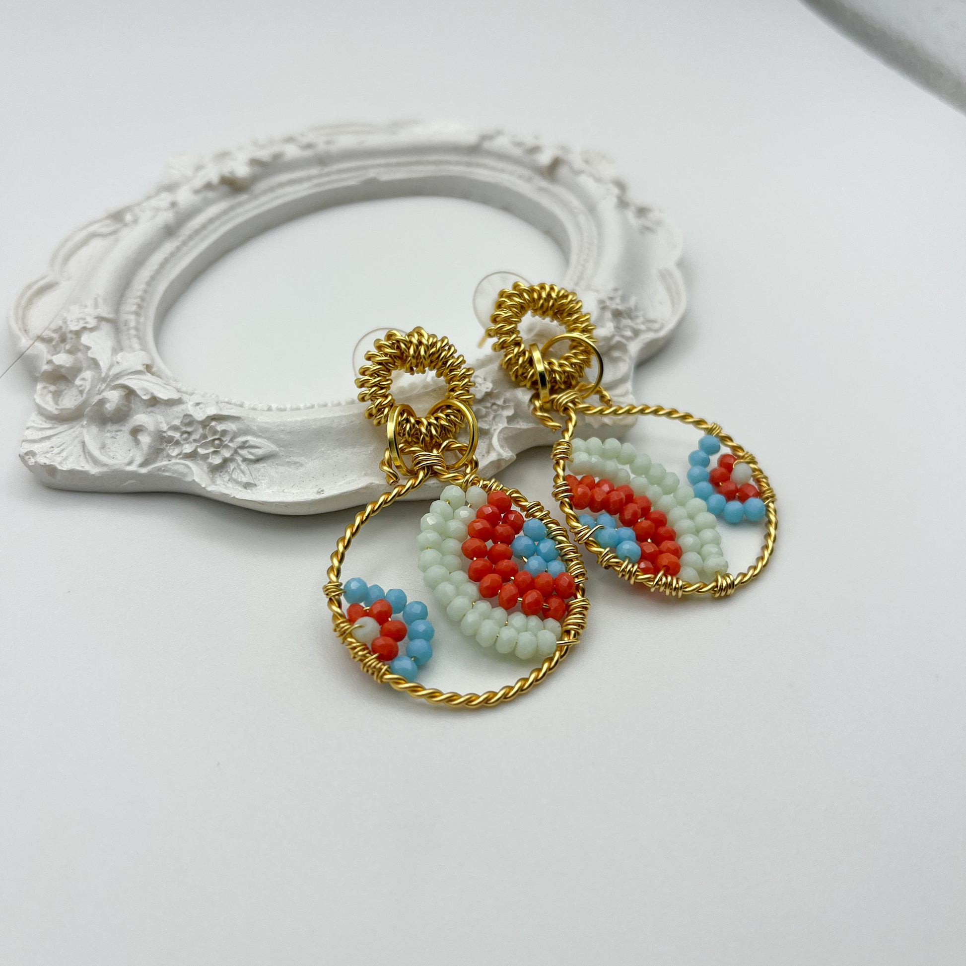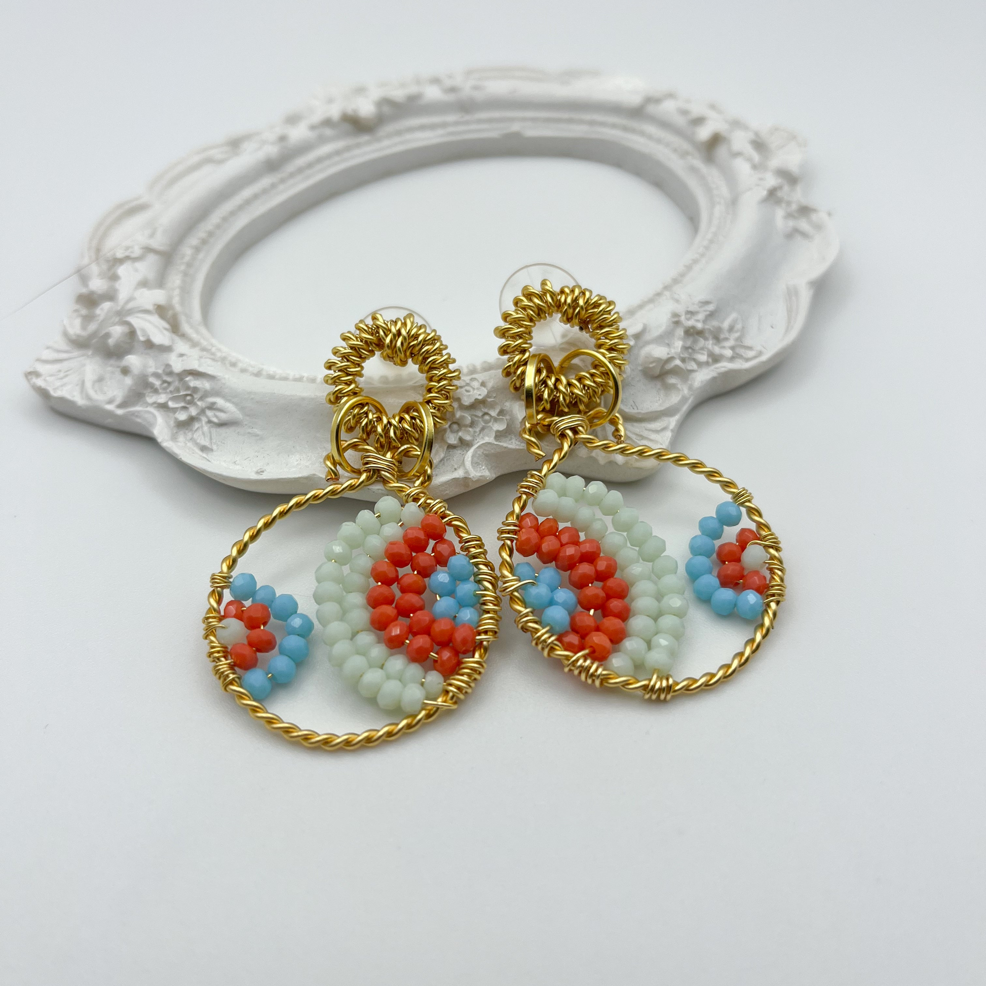 Earrings with a circular mandala design. A hoop of twisted wire frames the geometric pattern. A decorative post with twisted wire wrapped in a spiral. A vibrant handcrafted piece that combines the traditional technique of bead weaving with the elegance of gold, perfect for adding color and personality to any look.